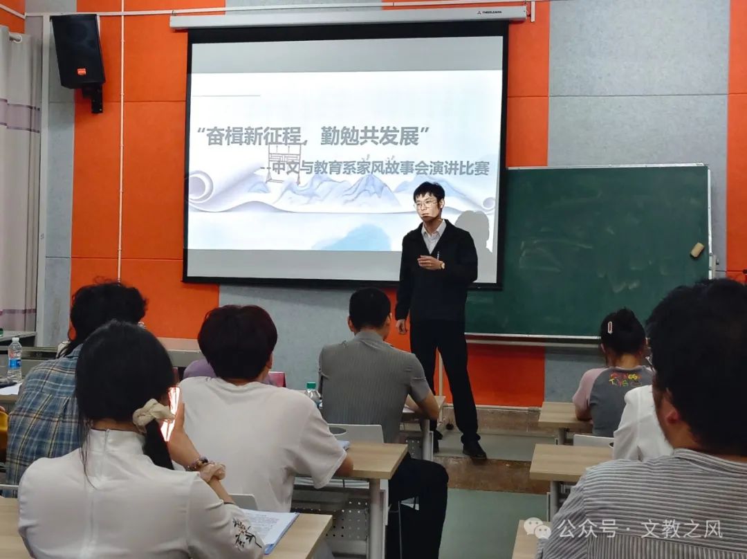 为深入学习贯彻党的二十大精神和习近平总书记关于“注重家庭、注重家教、注重家风”的重要指示精神,倡导践行好家训,弘扬好家风的理念,激励学校师生传承和弘扬良好家风,4月28日晚中文与教育系于实验楼409教室开展了以“奋楫新征程,勤勉共发展”为主题的家风故事演讲比赛,本次比赛邀请了杨道海老师、洪婷婷老师、叶燕琴老师和李轲老师进行现场评奖与表彰。
