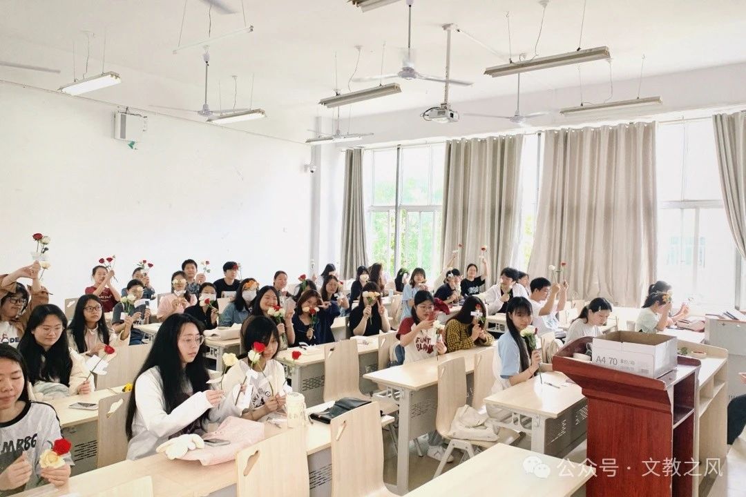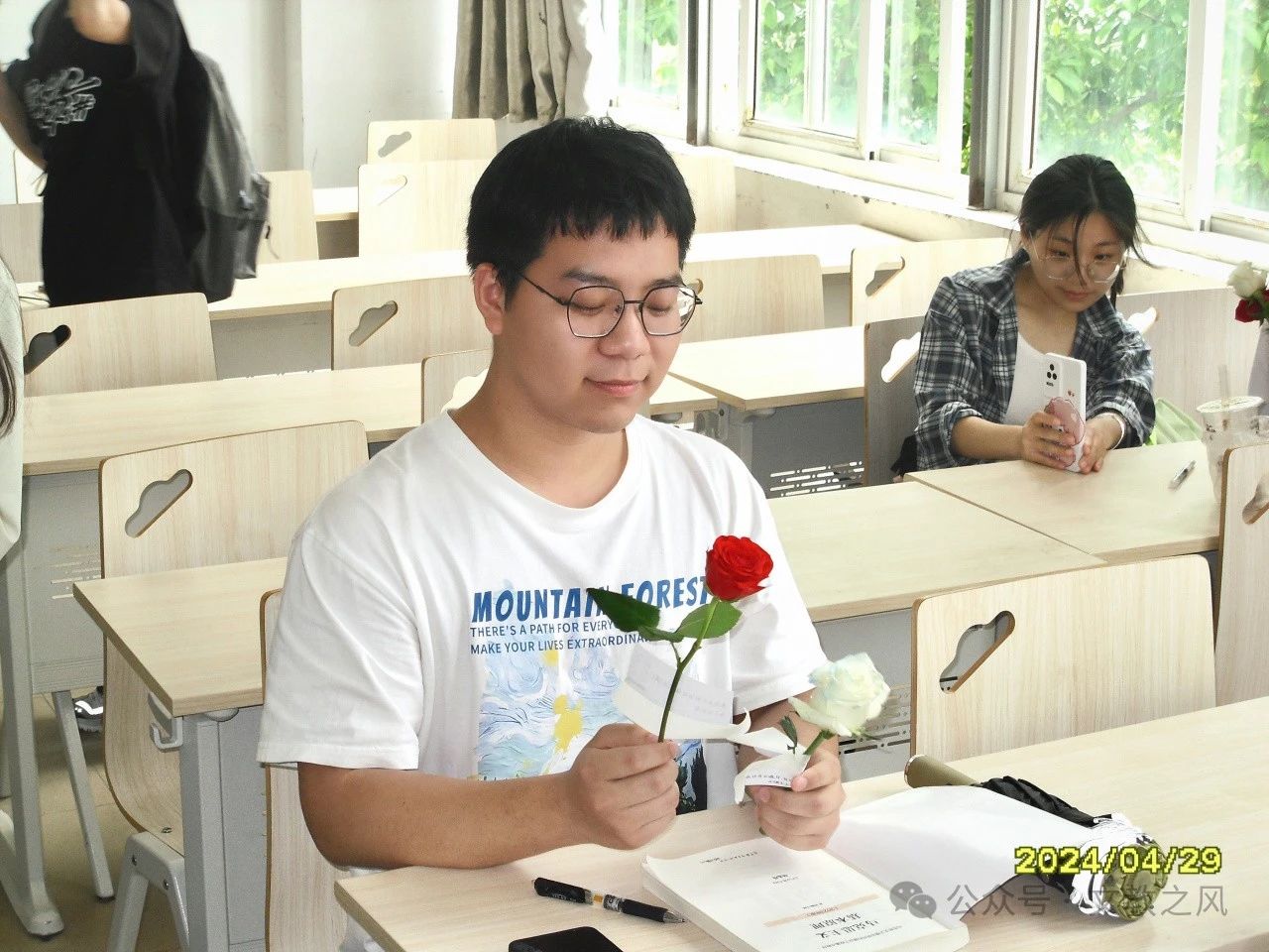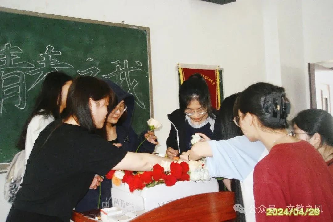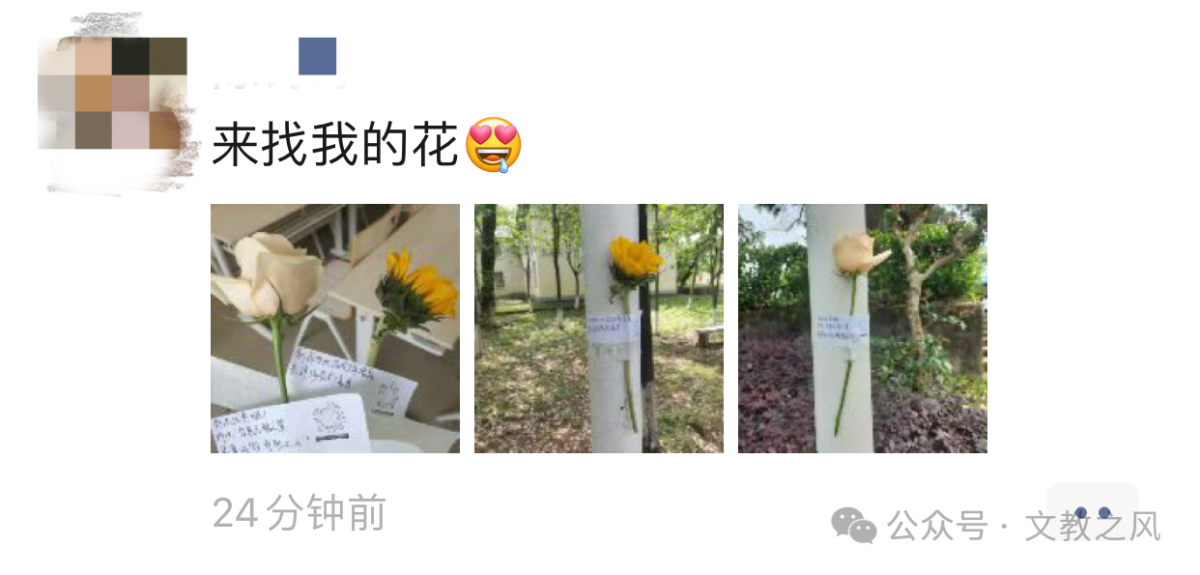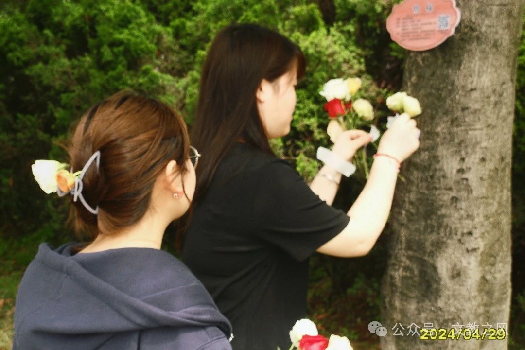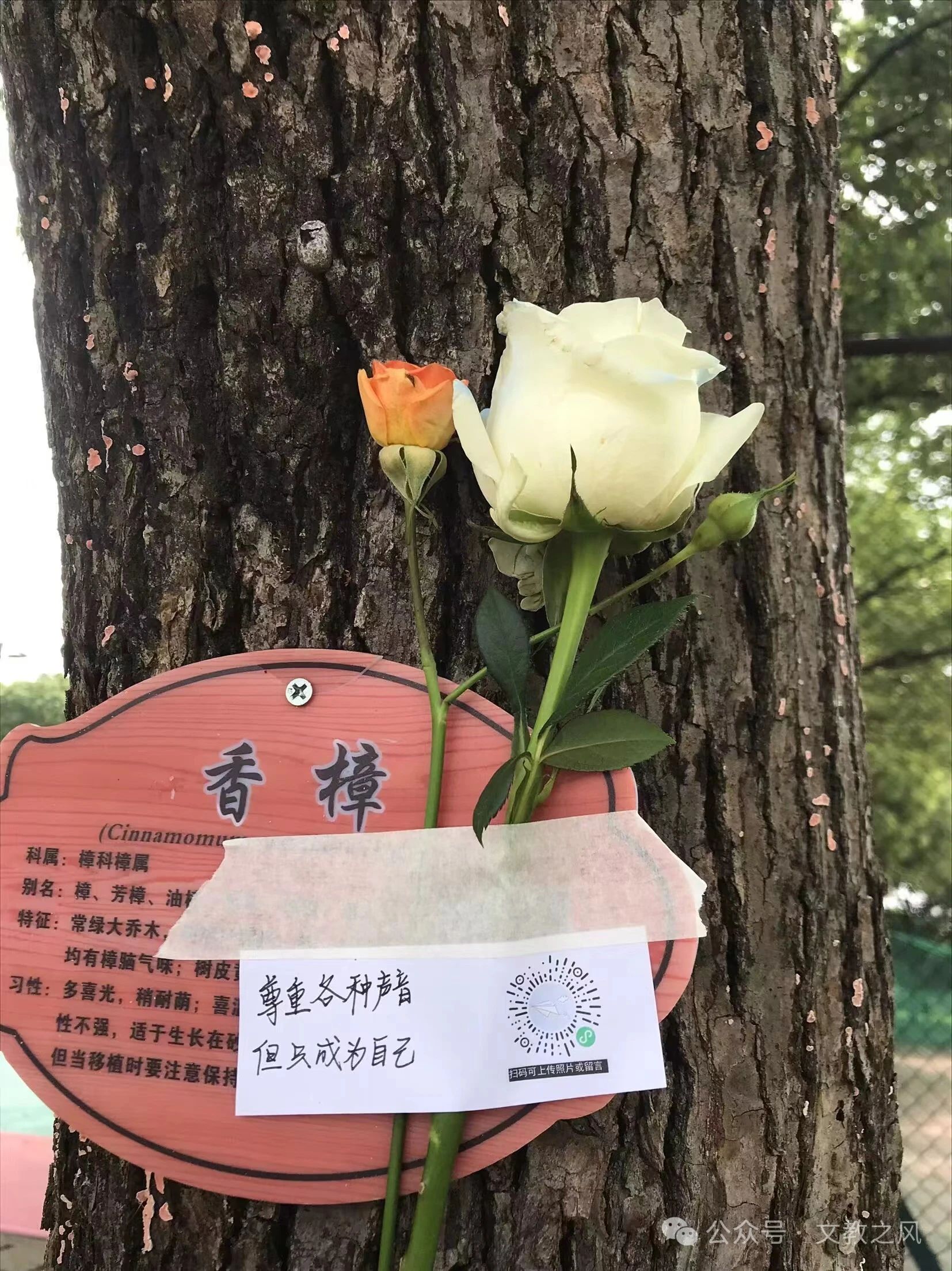 同同学们一一挑选喜欢的鲜花,并将纸条与鲜花粘在一起,在不破坏环境的前提下将鲜花和纸条粘贴到校园的各个角落。