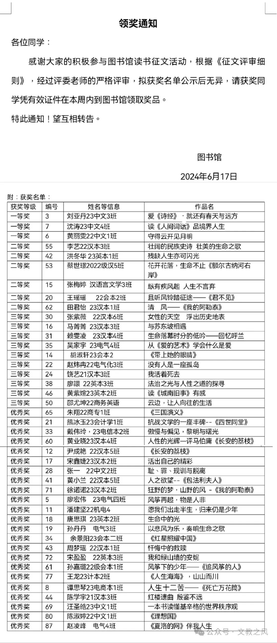 近期图书馆主办的“我最喜爱的一本书”读书征文比赛 已圆满结束。我系共有3名同学荣获一等奖,4名同学荣获二等奖,4名同学荣获三等奖,10名同学荣获优秀奖,中文与教育系获得“优秀组织奖”